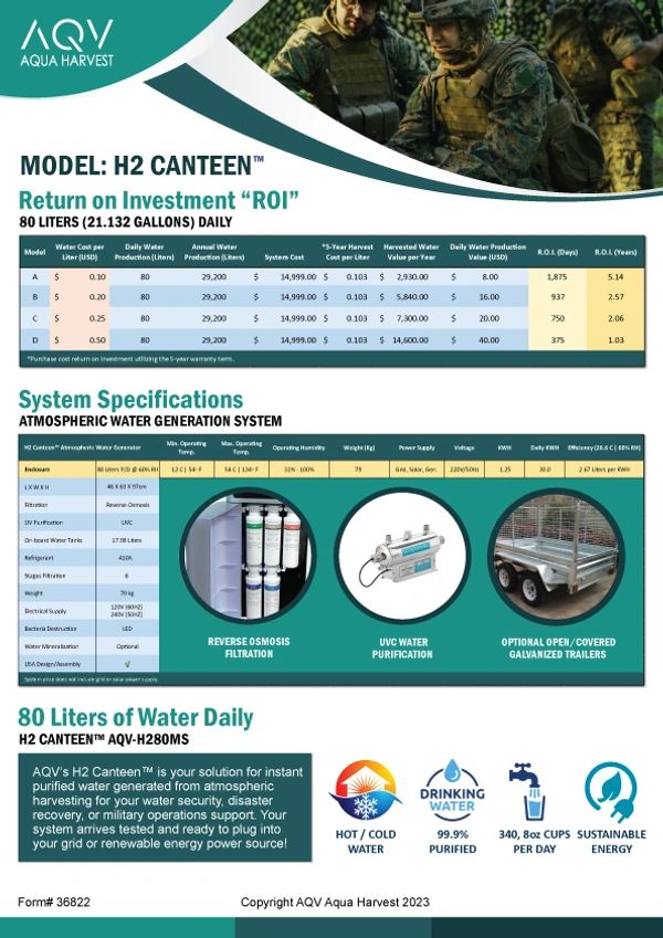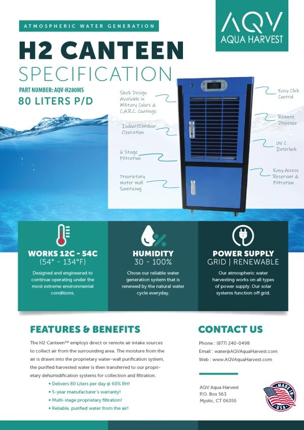 The H2 Canteen™ is a testament to our commitment to air water generator innovation, and we are dedicated to exploring atmospheric water generation diverse applications to address the water needs of various sectors, including the military and disaster relief efforts.